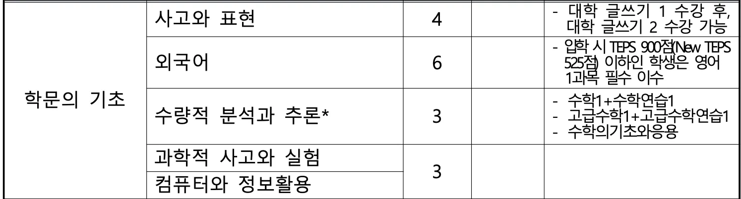 자유전공학부 교양과목 학점배분구조 표에 따른 교양 필수과목 중 학문의 기초영역에서 8학점 이상 취득