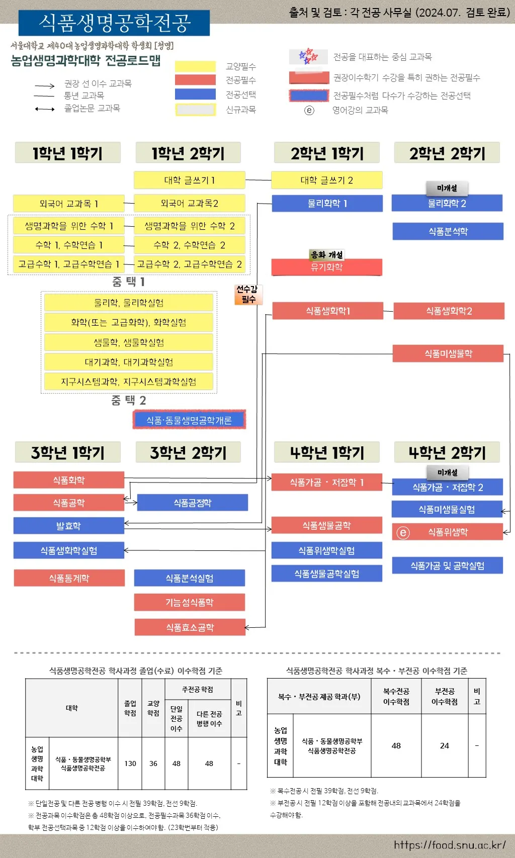 [출처] 서울대학교 식품생명공학전공 공식 홈페이지 > 학부소개 > 교과과정 > 학사과정 전공과목 이수 표준 형태 https://korean.snu.ac.kr/교과
