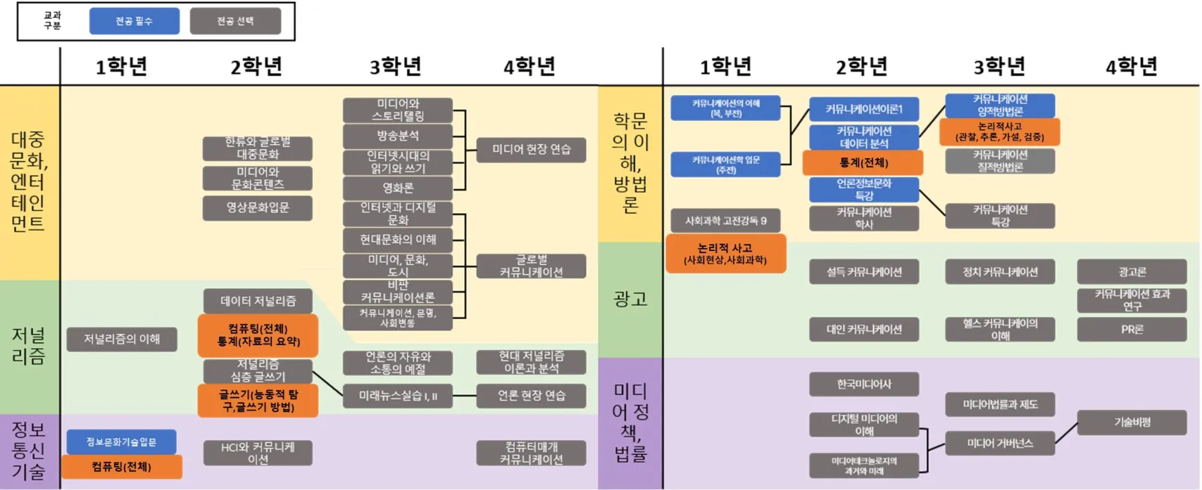 [출처] 서울대학교 언론정보학과 공식 홈페이지 > 학부 > 교과과정 > 전공이수 표준형태 https://communication.snu.ac.kr/학부/교과과정/전공이수-표준형태/#none (검색일: 2024년 6월 25일)