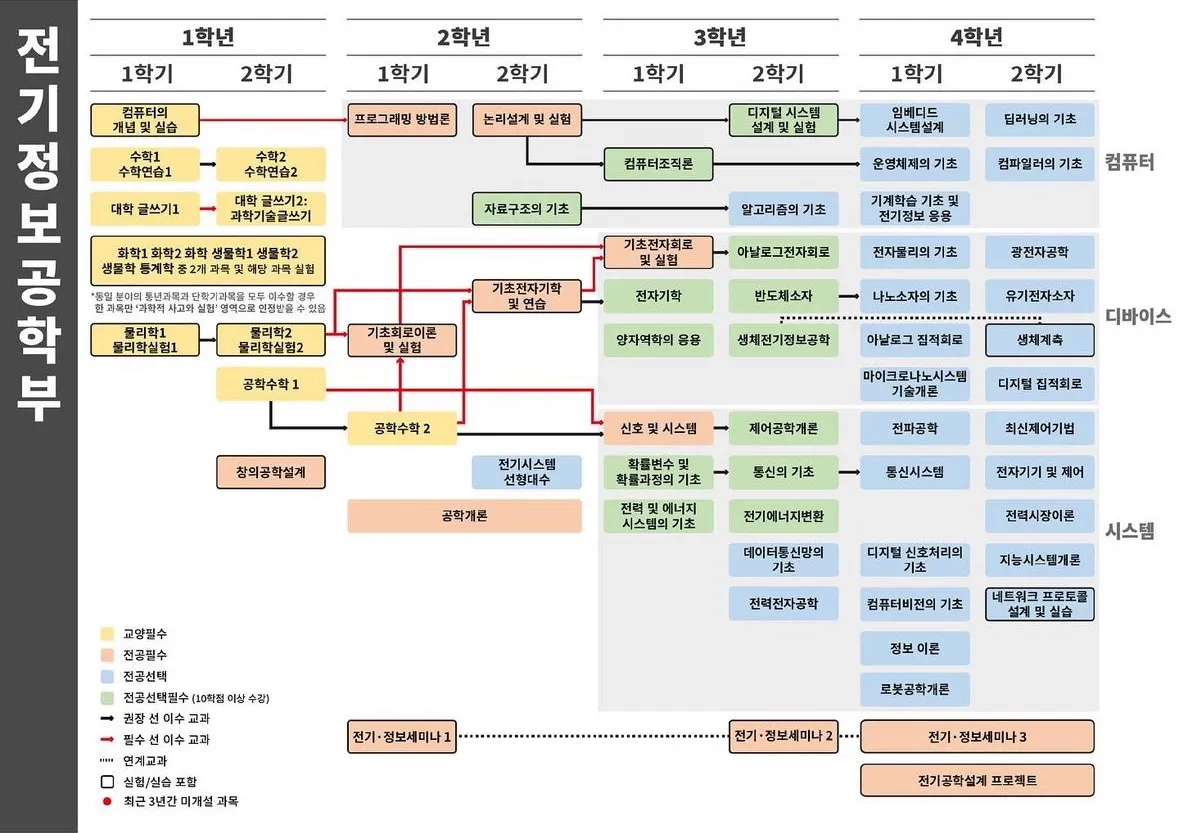 전기정보공학부는 다른 전공에 비해 각 학기 들어야 할 과목이 분명히 정해져 있는 느낌이 들고, 특정 선이수 과목을 수강한 기록이 없으면 전공 과목 수강신청이 불가능한 상황이 있기 때문에 시간표를 짤 때 유의해야 할 것 같다. (22학번, 2023-1 진입자, 2024.07 작성)