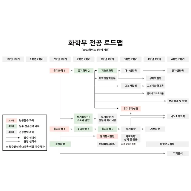 [출처] 서울대학교 화학부 공식 홈페이지 > 교육/학사 > 교육과정 > 학부 교과과정 > 학사과정 전공교과목 이수 표준 형태 / https://chem.snu.ac.kr/academics/undergraduate/standard-form (검색일: 2024년 6월 28일)